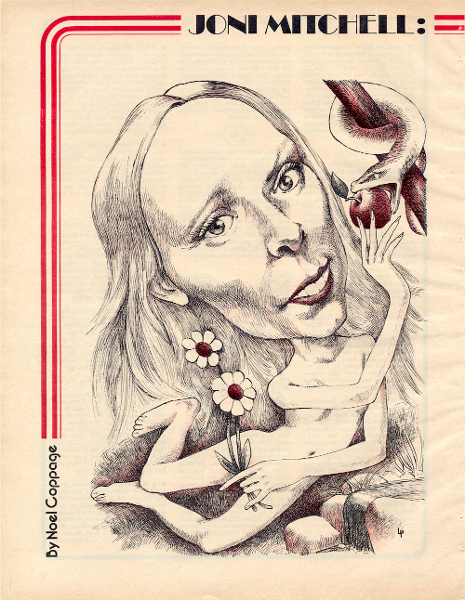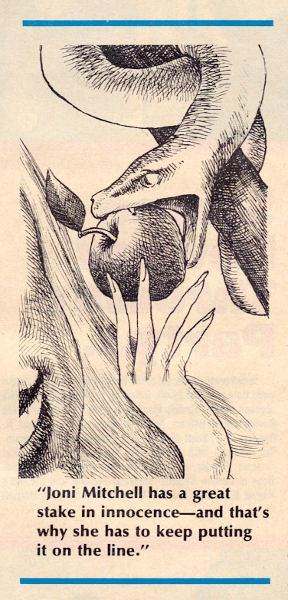 Joni Mitchell would seem to be all there, in black and white, in her own words. She has made a hardheaded, crusading effort to describe intimate feelings in her songs, and her candor covers style as well as content. The popular-music audience has seldom encountered a songwriter so open about the specifics of personal hopes and fears, or a writer-performer so overt, as Ellen Willis said, about her artistic pretensions. No wonder Time observed in 1974: "Everyone seems to know Joni. She is the rural neophyte waiting in a subway, a free spirit drinking Greek wine in the moonlight, an organic Earth Mother dispensing fresh bread and herb tea, and the reticent feminist who by trial and error has charted the male as well as the female ego." Also, for good measure: ". . . a modern Isadora whose life is a litmus for the innocent and the imaginative." But there's too much color, too much contrast in all these images and "everyone" is too many people; we have so much information from Joni and her Muse that we're back where she was after she'd seen both sides of clouds, love, and life: we really don't know her at all. And there's one more image that begs to be added to the list: a modern Eve dispensing apples from the Tree of Knowledge; the big blow to innocence comes when you realize that the more you learn, the more there is to learn.