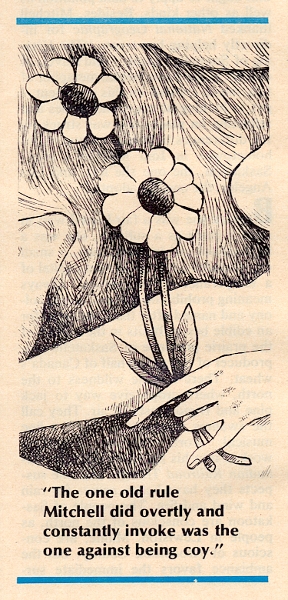 Mitchell somehow kept herself from hearing "you can't do that," a sound as familiar to most of us as the refrigerator motor kicking on - and this was at once a romantic and realistic deaf ear she managed to turn. Being romantic, taking chances - Playing Cowboy, I call it - is a practical matter for an artist. The one old rule Mitchell did overtly and constantly invoke was the one against being coy. She has not hidden her ambition to make art any more than she has hidden her hopes and disappointments. Or her terrors: no matter how scary it is, she'll say it. We who live by our wits worry most, probably, about our minds drying up, and there's Joni: "I'm just living on nerves and feelings . . . with a weak and a lazy mind." That really isn't her, is it? That's the way she was feeling at a particular time; she was ignoring the political rule, in and out of music, to present a single image free of inconsistencies. When she does have a consistent feeling, she presents that, too - she has regularly looked for strength in a mate, for example: "I went looking for a cause, or a strong cat without claws" and "Send me someone who is strong and somewhat sincere" and "It takes a heart like Mary's these days when your man gets weak...." And she has noted with due irony the situation men are in nowadays where strength in a mate is concerned: "You don't like weak women, you get bored so quick . . . You don't like strong women, 'cause they're hip to your tricks." She does not, in short, nail much of anything down; she just does not like to generalize.