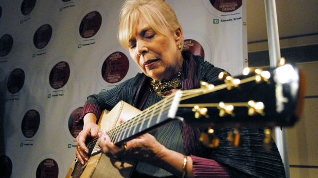 Joni Mitchell plays a guitar presented to her by guitar makers Robin and Claude Boucher (not shown) at the Canadian Songwriters Hall of Fame Gala in Toronto, Sunday, Jan. 28, 2007. Photo © Aaron Harris / THE CANADIAN PRESS