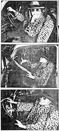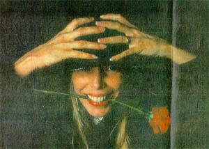 During the interview, Mitchell conducts herself with confidence. She is dressed in a striking black outfit of gaucho pants and a loose jacket belted over a black and silver blouse. A heavy silver necklace circles her neck and two silver earrings —one shaped as a feather, the other as a fish Skeleton—dangle to her shoulders. A black hat tops her long, stick-straight blonde hair.