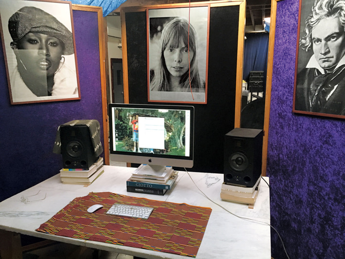 When the Dirty Projectors front man David Longstreth set up his studio in L.A. to work on his new self-titled album, he had two things on his mind: change and stability. So he started by erecting a shrine to his teenage musical idols as a reminder of who he was and who he might still like to become. "I was looking for all kinds of advice, you know?" says the 35-year-old singer and guitarist. He settled on an eclectic holy trinity - Missy Elliott, Joni Mitchell, and Beethoven - to watch over his sound mixing. But his wall of fame is constantly changing - Miles Davis, Stravinsky, and the 12th-century saint and musician Hildegard of Bingen have all cycled through - with Mitchell as the only permanent occupant. "She knew herself really early on," he says. "The music that she's made attests to this curiosity about life and music and a willingness to just keep growing." In addition, the setup is mobile: The desk has wheels, and the walls are nothing but ten-foot sound baffles. When he needs a change of scenery, he just moves the desk. "I'd hit a wall and think, What can I do to get beyond it?" he says. "Well, maybe start by just reconfiguring the space. You can trick yourself, in a good way."