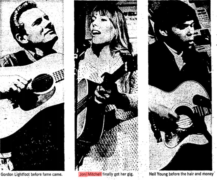 Fiedler likes to tell similar stories about the other just-starting Canadian singers. Young, for instance, he remembers as "a cat with no kind of voice at all. He was with the Mynah Birds rock band, and he'd come into the club to sing at our open hoots every Monday night, and even though his voice wasn't much, everybody thought he was one fantastic songwriter, which he proved when he split for California and got going with the Buffalo Springfield."