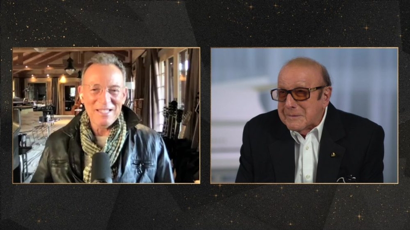 At the show's midway point came a vintage highlight: Bruce Springsteen, who signed with Columbia Records when Davis ran the company in the early 1970s. After screening a live version of "Born in the USA" from the late 1980s, Davis said, "I've waited many years to say this again: Ladies and gentlemen, Bruce Springsteen." The Boss, beamed in from his New Jersey studio, reminisced about how, after submitting his first album to the label in 1973, Davis said it needed a couple of radio hits. Davis recalled that unlike many artists, Springsteen did not get offended by the comment.