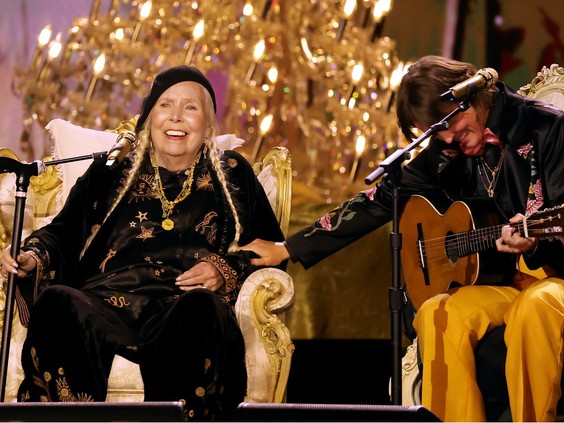 Surrounded by musical friends including Brandi Carlile, the 80-year-old Mitchell sat in an easy chair that resembled a throne, tapping her cane as she sang "Both Sides Now." Her voice, which she had to recover after a brain aneurysm in 2015, brought a richness and perspective to the song that could only be hinted at in the original. Mitchell was visibly moved by the audience's reception, smiling and laughing after she finished.