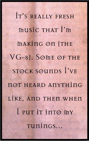 JM: I really like the brass sounds. Two of them in particular really translate well to my style of playing. It all comes down to that. For instance, I love the sound of a Les Paul. But it does not suit my style of playing at all. Other sounds do. The riptide created by passing chords works with certain sounds and not with others. But the VG-8 has got this enormous palette of sweetening colors... I prefer overdubbing with it to synth keyboard stuff, absolutely, because of the bending and everything. I never could work a portamento correctly, to get that loose bit of grease in there.
