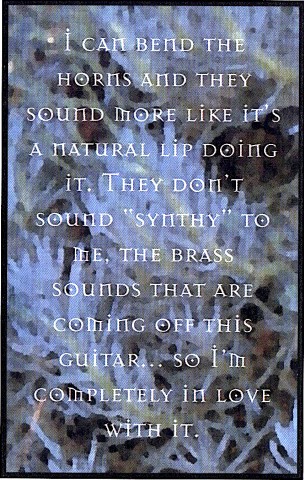 JM: But with the VG-8 it's right under your finger [makes string bending noise]. You know? Stacking brass now as a guitarist, I can bend the horns and they sound more like it's a natural lip doing it. They don't sound "synthy" to me - the brass sounds that are coming off this guitarÉ so I'm completely in love with it.