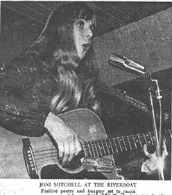 During her second set last night at the Riverboat, Joni Mitchell got to reminiscing briefly about her first job as a professional singer at a coffeehouse in Calgary called The Depression. She placed the year by saying it was just about the time the Beatle skyrocket was taking off.