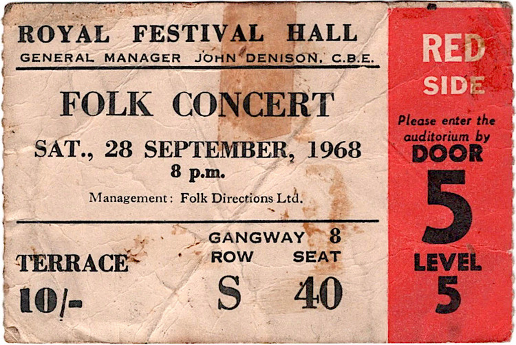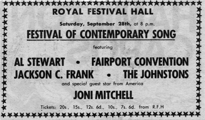 Some concert! I was there! It was an evening that turned on it's head as Jackson C Frank simply mesmerised the audience and the following day the critics. I actually met the guy later at the famous Les Cousins Folk Club reason being I was planning to go there and not this concert. Reason? Martin Carthy & Dave Swarbrick were on at the club. Which would you choose? Yeah, spoilt for choice and couldn't be in two places at once. [ed.]