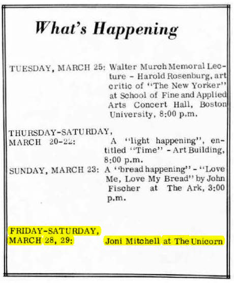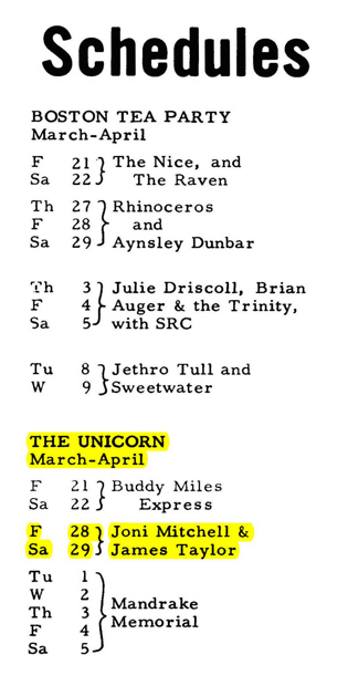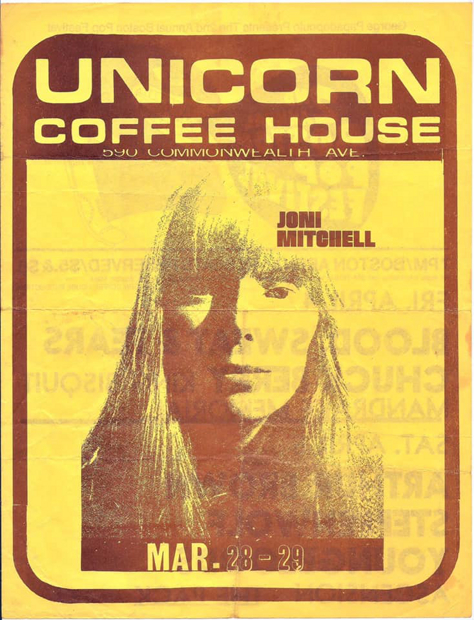 I saw James open for Joni, but I don't recall it being at the Unicorn, which was on Boylston Street - it was at a different club near BU. (The Unicorn might have moved there; it's been a while, and a lot of Boston clubs changed locations). Actually, James Taylor didn't open - two local folkies did (should have been Jackson Browne, then it would have been a Tom Rush "Discoveries" concert), and one of them made the big mistake of telling off-color jokes. The crowd, there for Joni, was very unhappy, and James Taylor came on second facing a restive audience. He got them on his side with his Jose Feliciano-inspired CocaCola commercial and "Steamroller" and had a great set. Joni came on and said she was exhausted; she'd been up almost all night finishing "Clouds". Nevertheless, her performance was flawless and inspired. The first of many times I saw her, the last being on Boston Common one summer in the early 80s. A truly creative and poetic artist, one whose songs and performances are all still fresh and alive.