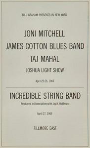 So, these two HIGH ENERGY, HIGH VOLUME acts are done. The stage must be cleared of the band's equip., and house lights were dimmed for this. All that Joni needed was a piano, and a stool center stage, and appropriate mic's. The stage was dark, a single spot light was lit, and this vision in a long white dress came out, just short of skipping. The sweat, heat and energy of the preceding acts hung in the air. She simply walked to the center stage mike and said softly, "Hi", and the mood was immediately changed and there was no one other than Joni in the house. She played and sang an incredible set. Another remarkable achievement of Bill Graham! A good time was had by all, except James Cotton's ankle. I still feel the void left by Bill's passing.