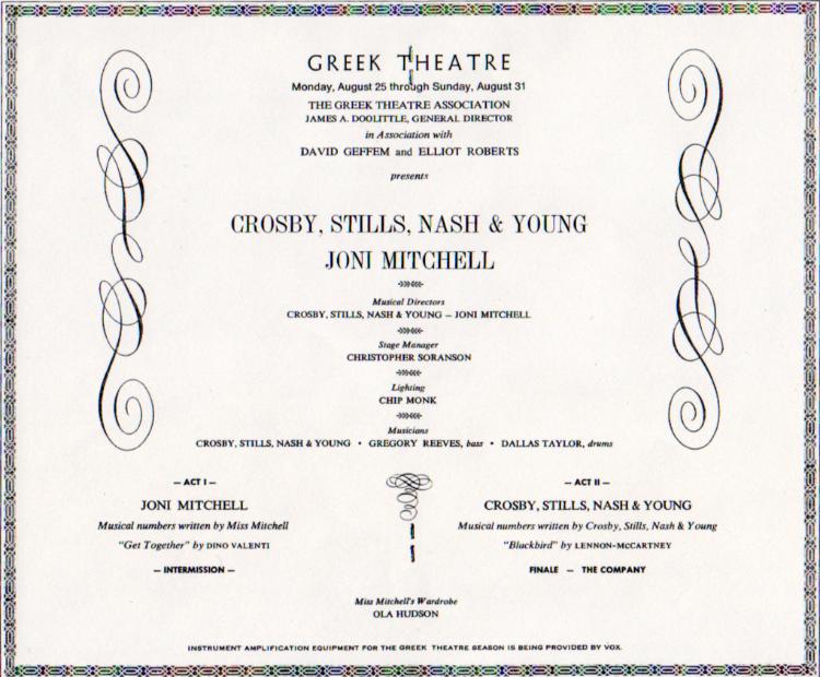 Elijah Butler writes: Joni opened for CSNY at the Greek Theatre in L.A. It's the only time in my life I had front row seats due to some chick turning hers in because she couldn't go. Joni was wearing white I think. Her piano was pushed back from the front of the stage so we couldn't see her because the stage was too high. Later she stood up front playing guitar. Beautiful. John Sebastian showed up and Buddy Miles shared a curtain call.