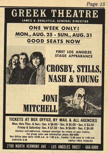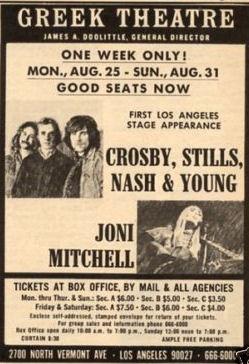 My best friend and I had loved JM since we discovered her in 1965 or '66 - we knew all of her albums by heart. When we heard about the concert at the Greek we were thrilled because I had my drivers license by then and could borrow my Mom's car to get there. We were more excited to see her than C,S,N & Y (although they remain favorites to this day as well.) She was amazing! Car broke down on the way home from Hollywood past midnight and my folks had to come and get us - what a memory that night was.