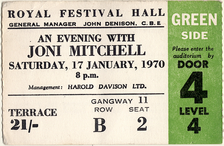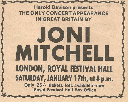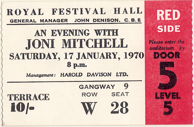 When I heard that my idol, Joni Mitchell, was doing a solo concert at the Royal Festival Hall, I could hardly restrain myself from singing out loud; in fact I sang through all the songs on her two LP's in the bath to celebrate. I had waited for this concert for over a year, since I first hear her incredible music. I telephoned and booked the tickets only three hours after telephone booking opened. I was amazed to receive tickets in row T in the 25 shilling seats! I had expected to be very near the front but I found out that 12 hours after booking opened, the seats were a quarter sold out.