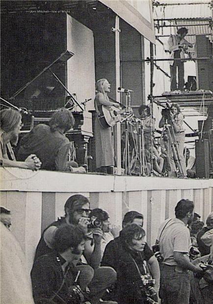 Phil Aldridge: I was an innocent 18 year old at the Isle of Wight in 1970. I don't remember helicopters. What I do remember was that there were lots of people on the hill (known as "Desolation Row") overlooking the festival site. They wanted the festival to become "Free" and I think they'd tried to break down the fences a bit earlier. The organisers, and those who'd paid for their tickets, didn't like the fact that these guys weren't prepared to pay their three quid (about $5) but were happy to share the music. There had been growing tension over the previous hours. I think Joni's comments came as she started her set and were aimed at what had been happening and not at the way people were treating her personally. I do remember being moved by what Joni had to say. It still makes the hairs on my neck stand up when I listen to the recording. Incidentally, a few hours earlier I'd been given a press pass by a hack who was leaving early. This got me between the two security fences. The real advantage to me was not the superstars that I could meet, but the chance to buy food without queuing for an hour. I got myself some fish and chips then turned round to see... Joni. I gave her a chip - don't remember if I offered or she asked. I still tell the "Joni ate my chips" story to anyone who'll listen - and you're the latest :o)