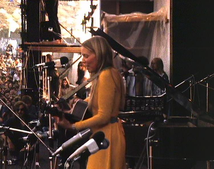 When Joni came out on stage, the size of the audience amazed her. She told them "It looks like they're making "Ben-Hur" or something!" All through her hour-long set, she had to deal with the noise of the rowdy and agitated crowds, and the frequent and distracting sound of small airplanes taking off. About two-thirds of the way through her song "Chelsea Morning" she stopped and told the audience "I don't feel like singing that song very much. Let me play you one on the piano." After singing "For Free," Joni paused and spoke again to the crowds: