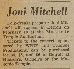 I was at this concert. The Masonic Theater is a fabulous venue. 4500 seats or so and acoustically perfect. An unknown singer/songwriter by the name of Jackson Browne opened for her. It was such a magical evening. I was young in those days and fell in love with Joni's music. A love that I have to this day.
