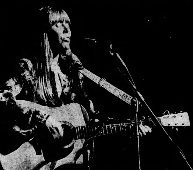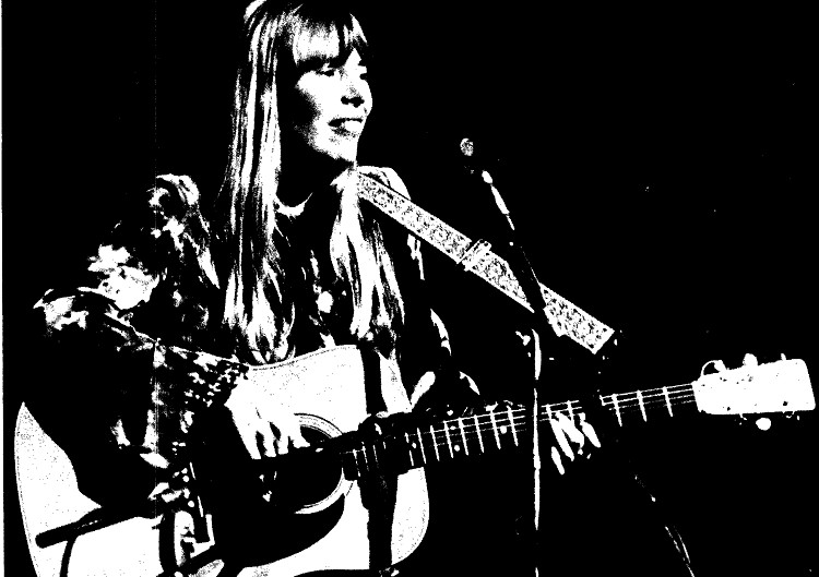 • Photo from the University of British Columbia's Ubyssey newspaper, taken by Kini McDonald. Caption reads: SMILING ECSTATICALLY while singing to 3,000 at the Queen E Wednesday night, Joni Mitchell thrilled audience with new songs.