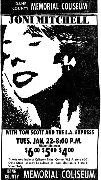 I saw Joni in concert at this venue. It was a really cold day and we'd had an ice storm in Madison the night before. It was a really great, memorable show and it stands out from all of the other concerts I've seen before or since with very few exceptions. The day after I got a call from a friend who worked at the university branch of the sporting goods company we both worked for. He said he'd sold Joni a pair of skates on the day of concert, the ones she wore for the cover art on "Hejira". He said he'd never wash his hands again.