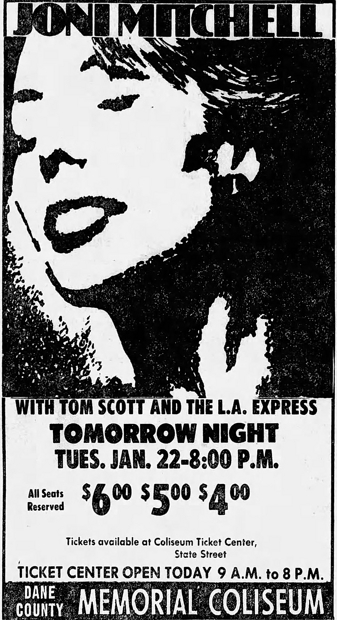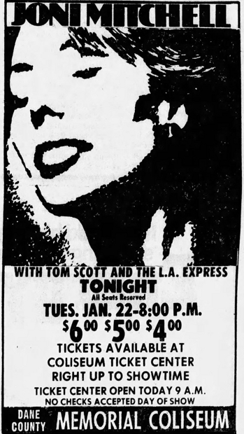 I thought I saw Joni in Milwaukee at the Arena or Auditorium, same venue where I saw Van Morrison and Elton John, but maybe it was at the Dane County Coliseum.? I knew every song by heart off of Blue. I also had Court & Spark and the double set where Joni was naked by the ocean but you saw only her backside.