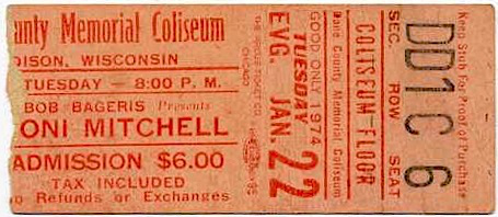 The big impression she made on me was that she changed dresses. I guess I had not seen a female singer in concert before Joni. Laura Nyro was my other love. I knew her songs by heart also. Anyway, it would have been my freshman year at Madison in Jan '74. Just wish I could remember better. Congratulations Joni, on singing live in Concert for your 70th birthday. all the best . . .