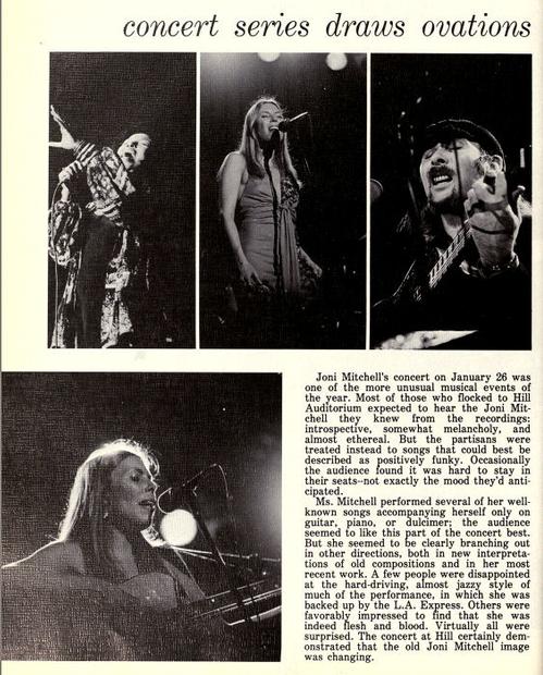 Joni expressed much of what we were feeling and pondering back in the day. Forty plus years after her 1974 appearance at Hill Auditorium, I still enjoy listening to her lovely, melancholic songs. Joni's concert at Hill was a special gem for her fans, perhaps because it was a smaller venue and seemed more personal. As a senior at Michigan and an editor for the yearbook, Michiganensian, I had a press pass and two, front row seats for the concert. I was there with my dear friend, Ruth, who went on to become a concert pianist. I remember we were surprised and energized by the jazzy tone of the concert. Although I must have had a cheap camera, the black and white photos I snapped for the yearbook are the same shown in her chronology. I was surprised and pleased so many years later to find the pix and my short article on Joni's website. I am happy to learn that this talented artist is on the mend following her recent aneurysm. Joni sweetly and beautifully memorialized and epitomized much of the angst of the rock 'n roll era. Bless her heart!