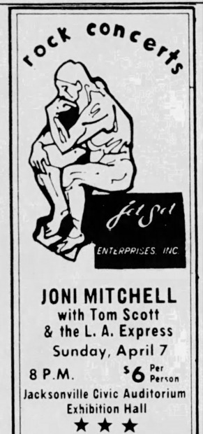 I attended this concert with my then partner, the lovely Ann B, and four of our friends. Upon arriving at the Jacksonville Exhibition Hall in mid-afternoon to pick up our tickets for the 7:30 show we discovered that the promoter, whose name will not pass my lips, had sold more tickets than there were seats (in the tradition of Mel Brooks's Max Bialystock)and that the venue had been changed to the cavernous Jacksonville Coliseum. Aside from the several hours delay, my party ended up somewhere in the ionosphere to the left side of the stage. The only time we could see Joni (who performed very well under the circumstances) was when she played guitar. When playing the piano, she was completely obscured by a bank of amplifiers. Not connected? I'm surprised she didn't hang up.