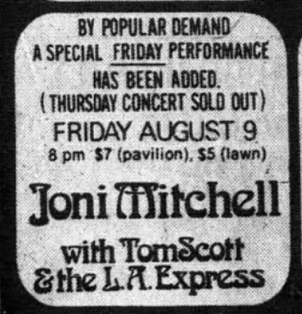 I attended this concert; it was my first Joni experience, and I thought I would faint from excitement. I always refer to it as the "Miles of Aisles" concert, as the cover of this album looks like the Pine Knob theatre.