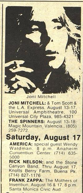 I was the first person to buy Miles of Aisles the day it was released from the Licorice Pizza record store on Wilshire in West Los Angeles and had tickets to three of the Universal Amph. concerts. I remember people getting up to dance - swing dance - in the aisles during Carey. My boyfriend, not a Joni Mitchell fan at the time, always remembered how the entire auditorium was dead silent during Case of You -- mesmerizing. Fans kept going down to the stage to put flowers all over the edge of the stage. We had picked all the roses out of a neighbor's yard and put them in a basket to bring to her. I was only 16.