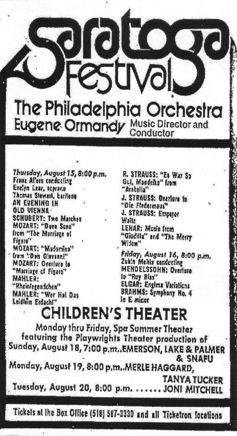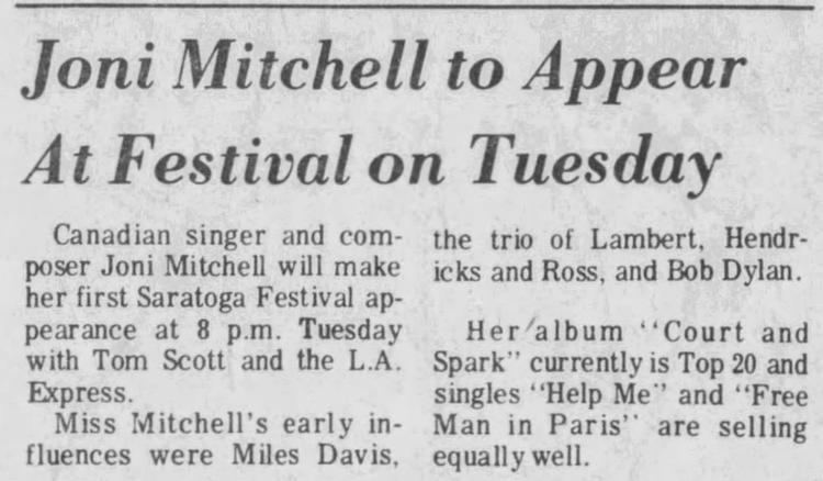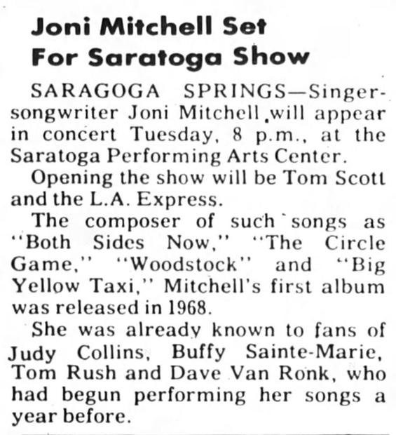Went to see Joni and the LA Express at SPAC with a date and some friends. I was and remain a major fan. Did some acid, as we did in those days, and got completely swept away by the Goddess - convinced that I and everyone else in that rapturous audience would leave with Joni and get back to the Garden following the last song. I could not believe it when people starting leaving the theater at the concert's end, instead of walking toward the stage to follow Her out and onto the path back to Paradise. I was eventually delivered safely, albeit very sadly, back to my humdrum existence by some kind strangers who rescued me from my shattered bliss and drove me back to Albany. Needless-to-say, that pretty much ended my relationship with that night's date.
