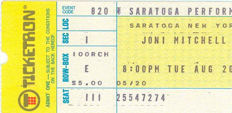 I had been a fan of Joni Mitchell and her music since I was 13. I went with some friends to see her for the first time at SPAC. We lived about a two hour drive away. We sat under the stars on a big blanket and I thought I had gone to Heaven. I remember her introducing the band, the LA Express. I also remember her playing the piano with such passion. At the very end she sang Twisted. The lights under the cover went up and I got up and walked down the aisle to get as close as I could. I got very close to the stage and sat down on one of the aisle steps. It is a time I will always remember like it was yesterday.