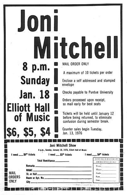 This is my favorite concert of all time. It took place at Elliott Hall Auditorium at Purdue University. The LA Express opened the show and then backed Joni during her set which was outstanding. As the show ended the stage went black and the crowd called for an encore. A dark figure walked to the stage from the right side. I knew from his walk that it was Neil Young. He sat down and started to play his guitar, still in darkness. As he began to sing Helpless the rest of the crowd realized it was Neil. They went crazy. Joni came and joined him midsong to sing along. He then told of how he had called Joni to sing Sugar Mountain to her over the phone. They then sang that song together. Joni then told us how she had written The Circle Game after hearing Neil sing Sugar Mountain. They then proceeded to sing The Circle Game together.I had goosebumps the entire time. Joni and Neil were my favorite musicians and here they were together. What a surprise!