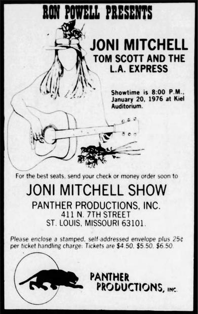I saw this concert at Kiel Auditorium. I remember it as a good show, Joni Mitchell with backing band the L.A. Express performing many songs from "The Hissing of Summer Lawns" and "Court and Spark". As the review notes, the audience was polite and quiet between songs. I don't remember Joni talking to the audience much, just performing the songs with basically straightforward renditions that were faithful to the album versions. I suppose if I could have asked for one thing, it would have been for her to come out and perform some songs solo on guitar and piano, perhaps numbers from "Blue" like "River". That would have been nice. But all in all, I got my moneys worth from the show.