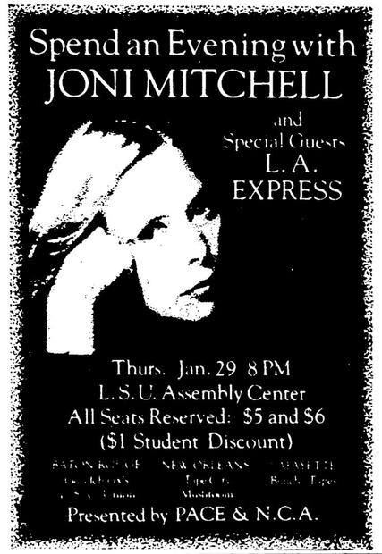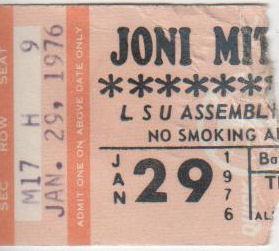 jqw: It was a Thursday Nite - I had to Skip Friday classes @ Louisiana Tech to be there .... Wouldn't have missed it for the world ...I was so in love (crushed really) - What I wanted to find out is: WHAT DOES JONI REALLY LOOK LIKE? - every picture reveals a different facet / look / impression of her depth/beauty, even today. We had really good seats, but I had to go down to the stage. At 6'1" the stage setup placed her feet right at eye level - about this time she mentioned something about Stephen Stills tuning her guitar or showing her how to tune her guitar to some 'open chords' or @$@($*)@*&$ I can't remember much else. I have been forever mesmerized/intrigued by her SPIRIT and ARTISTRY - even her BLUE nature, of which she comes by honestly. Long Live Joni Mitchell