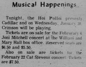 Outstanding concert! LA Express opening with their jazzy sound and then backing her up was a nice surprise. Joni seemed to have an especially good relationship with their keyboard player. My girlfriend Rosemary and I were students at William and Mary, class of 1978. We were announcers (DJs) at the campus alternative radio station WCWM and we played a lot of her songs. We were very fortunate to get tons of great concerts while we were at Wm and Mary, and Joni was certainly one of the best .... Rosemary and I went to them all ... others I can think of off the top of my head include Grateful Dead, Little Feat and Dave Mason, Bruce Springsteen, Kansas, Frank Zappa, Jefferson Starship, Neil Young with Crazy Horse, David Crosby and Graham Nash, Electric Light Orchestra, Jackson Browne, and some others I'm sure.