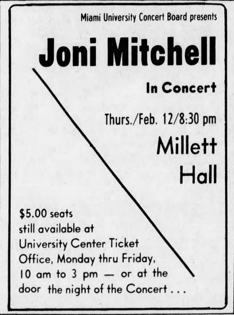 My first Joni concert, even though I had adored her since 1968 when I was 12. I drove from Richmond, Indiana where I was going to college to see her at Miami U. I can't remember who I went with, even though it was a HUGE deal for me.