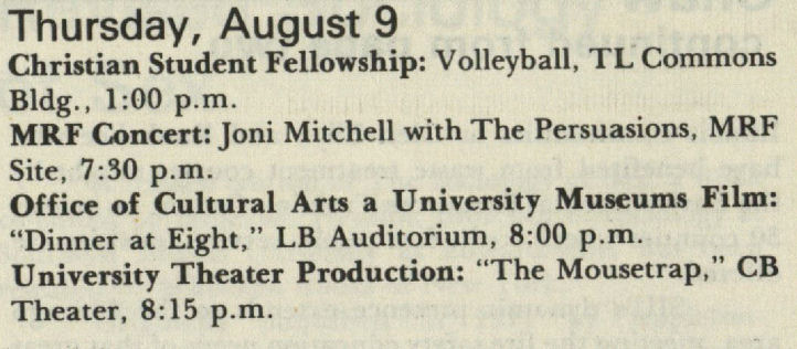 My future wife and I saw Joni "under the tent". I wanted to be sure that any chance of rain would not spoil the evening of great music. We slowly strolled in to the sounds of the "warm-up" band, that Joni was touring with. They accompanied her on "Shadows and Light". The festival did not allow cameras, so I hid my 35mm in my socks, and a piece in her purse. I assembled the camera, and took some non-flash pix. I still have them. I remember that Joni forgot the words to "Amelia" in the middle of the song. Laughing, she said it had been "a long time" since she had sung it concert. She recovered. So did I.