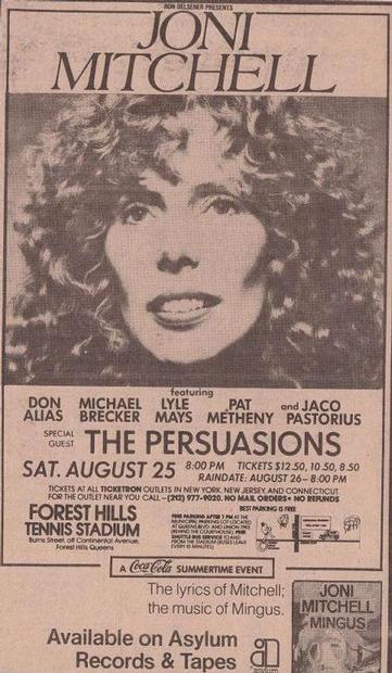 This was two years out of college for me. I ran into a girlfirend from school and we decided to see Joni. It was at the old Forrest Hills Tennis Center in Queens. The concert was outside and under the stars. The Persuaisions opened and were great. Then Joni with her band and friends came out and were even better.
