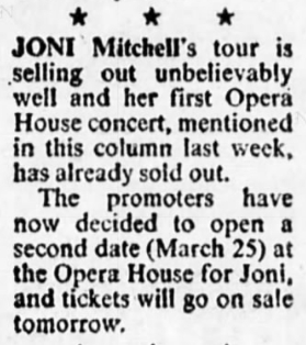 I spent 2 months in Sydney before spending another 4 months hitching around the country. The Joni concert was the musical highpoint in the capital (easily beating Dire Straits at the Botanic Gardens - although Redgum at Kuranda Amphitheatre probably wins overall).
