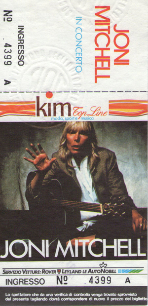 It was Joni's first concert in Italy, and it was my first Joni concert ! She performed in a magic set , the old roman theatre, in front of an attentive crowd that grew enthusiastic when she played " God must be a boogie man" and " I Heard it through the grapevine ". Beautiful concert, Joni so professional and beautiful.