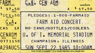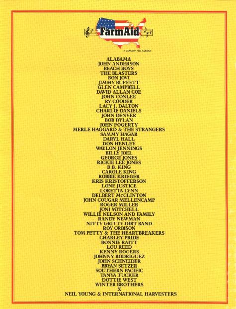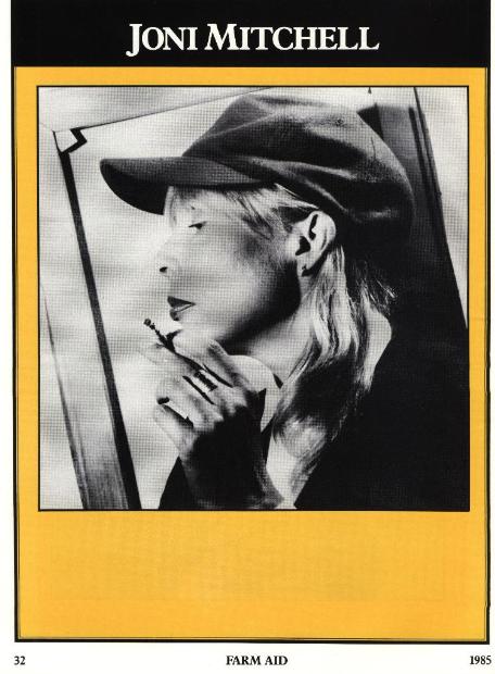 During the mid-80s, while she was not touring regularly, Joni occasionally took the opportunity to appear at what she considered worthwhile benefits. These included "Farm Aid" (FA) (9/22/85) and "Amnesty International" (AI) (6/15/86). Even though she actually exceled at these events, they unfortunately left her with the opposite impression - that her music was no longer valued. They thus served to validate her decision not to tour.