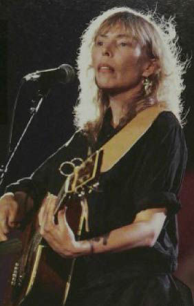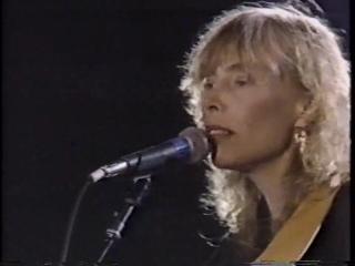 Joni has always done benefit concerts throughout her career, most notably in the mid-80s, when her audience had dwindled and her live concert gigs were increasingly rare. Her appearance at Farm Aid, 1985, could be described as World War III (her own words). She comes on stage chewing gum, talking in a southern accent, and wearing a designer dress of black-grey-white stripes and her trademark black beret perched on top of her eighties-style perm hairdo. A white acoustic guitar hangs over her shoulders. She launches into "The Three Great Stimulants of the Exhausted Ones" before a rowdy, drunken crowd of country/rock fans who wouldn't shut up during what turns out to be a rather lengthy sermon. Joni looks surly (where was she stashing her gum all this time?) but she uses her frustration to fuel the anger of the song. Her voice is low and mean (you'd never dream this was the same woman who sang about "peridots and periwinkle blue medallions") and her singing ballsier than ever before. But finally, in mid-song, she blurts out: "How can you hear when you talk?" Now she's using the anger of the song and directing it back against the crowd. On her second song, Dog Eat Dog, she invites the audience to sing along but they just keep talking. This time, another indirect jab at the audience with an ironic reading of the line "land of short attention spans." One could talk about performance etiquette: What do you do when the audience you're trying to reach doesn't want to listen? Do you just keep going along like nothing happened, do you walk offstage, or, like Joni, do you use your feelings about the audience to inspire your singing? I think the last choice is maybe the most honest, and the most interesting to watch.