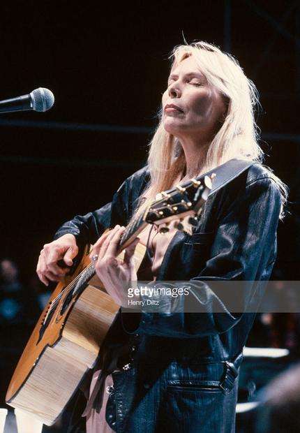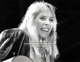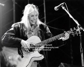 Next is "How Do You Stop," her cover of a James Brown tune. Then "Hejira" starts magically to applause until Joni stops in the middle of the second verse. She starts singing "... We're only particles of change ... wait a minute, that's wrong ... does anybody know what comes next?" I was aghast at the fact that nobody immediately belted out "porous with travel fever, Joni, porous with travel fever!!" like I certainly would have done (she says pompously with the gift of hindsight) but after a full minute of listening hopefully to the equally amnesiatic crowd, the light comes on and she continues, "I'm porous with travel fever, but you know I'm so glad to be on my own ..."
