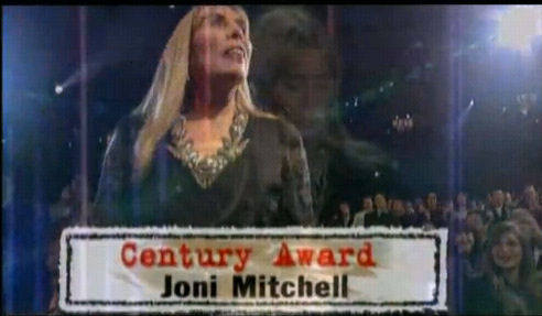 The presentation came about half-way through the show whose overall purpose was to present awards to various artists for their record sales, and featured performances by mainstream performers (e.g., Hootie and the Blowfish, Michael Bolton, Stevie Wonder, and an incredibly sexy performance by Shania Twain). It began with an introduction by Peter Gabriel. What may not be completely obvious from his words themselves was the pride he showed in being able to present it to someone who, as he stated, continually "put substance before style and passion before packaging", ... with "imagination, invention, intelligence and soul". His initial speech was followed by a video of several minutes duration, starting with the classic clip from the Johnny Cash show of a young and beautiful Joni singing "Both Sides Now", and continuing with images from the following 25 years. Several performers and Timothy White offered explicit praise. [As an aside, these included comments from Graham Nash and David Crosby indicating how Joni had written Woodstock from their ramblings, which she later strongly denied]. The voice-over noted that Joni was "welcomed back" by the general community (as if she had really been away) with "Turbulent Indigo" in 1994.