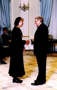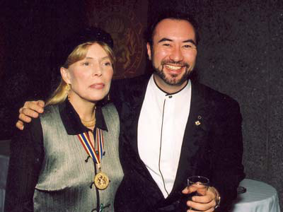 Joni Mitchell was one of eight Canadians who received the Governor General's Performing Arts Award at Governor General Romeo Leblanc's residence, Rideau Hall, in Ottawa on Friday, November 1. The awards, each worth about $10,000 (Cdn), are presented annually to distinguished Canadian performers/writers/artists. Previous pop star winners include Neil Young, Leonard Cohen, and Bryan Adams. My only question is why did the G-Gs take so long to discover Joni Mitchell?