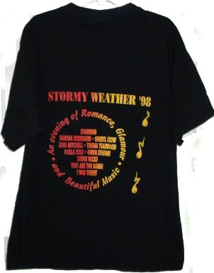 jm chose a modified ATHENA look for the elegant Stormy Weather 98 evening. she boogied out to Bjork's hyperbolic introduction in a steel-blue on steel-blue stripe knee-length straight line metallic number with a matching square, hem-length scarf hangin' down the back.