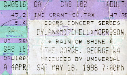 (From:chissmith@email.msn.com)-I just saw Joni at the Gorge on May 16 with Van and Bob. To preface this personal review, I am and old Joni fan from the 70's. To me Joni was the best. I used to pick her albums apart whenever they came out, digesting every word and musical note, until my head and soul was filled. I came to the Gorge to hear that old sound. I wanted to hear that grand piano, I wanted to hear that acoustic guitar with the great tunings. I was given a clue that this was not going to be my night. Joni began her concert by saying that the reviews from the Vancouver concert stated that she didn't play enough of the the old songs. She stated that she didn't prepare the piano or the acoustic, but she hoped that the songs she did pick would satisfy everyone. In other words, here's what I've chosen, I hope it works for you. Coming from an artist like Joni, I respect that. The work that she did perform was top notch. Her voice lacks the old three octive range she did so well, but what she did sing was pure Joni. Her electric guitar was flawless.
