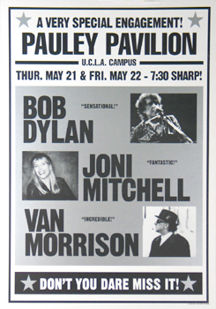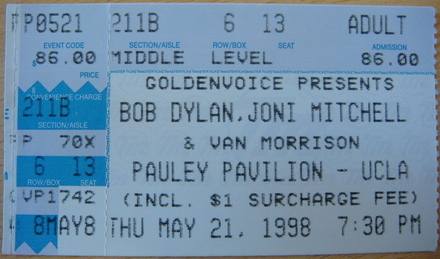 You must understand, I'm no longtime fan of either Bob or Joni or Van. While familiar with and deeply respectful of them all, of course, I possess not one album by any of them. Fact of the matter is I won tickets to the show during a Jim Ladd show on KLOS FM, and I went because of a combination of the sheer superstar scope of the event AND the great seats. If they'd been cheapies, there was a good chance I would have taken a pass on the whole affair.