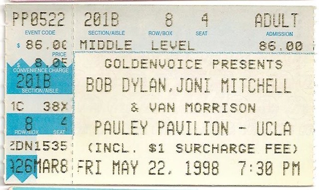 (From: Dennis Reader, dreader@earthlink.net)- I own a small independent record store in Denver, Colorado and when we had a customer come in to inquire about tickets to the concert in L.A. we were surprised to get tenth row seats. The only problem was the show was in L.A. but we decided to go for it since we knew it would be a once in a life-time event. I have seen Joni at Red Rocks but my friend, Carolyn has been a fan for a long, long time and had never been to see her. The show was awesome. Dylan rocked the house and not once did anyone mention it was his birthday- May 22nd. Joni looked and sounded as good as ever . We loved the way she explained each song to let us know how she came about writing the lyrics. We could see that same beauty and youth that she has always had and she carries herself so gracefully. If it had not been for Joni none would have said anything. Van was terrific even if he looked excatly like Dennis Franz. We could not hear the name of the kid that sang with Van but he was fantastic- let us know if anyone knows his name. The show was well worth the distance to get there. I would have loved a Circle Game or a Blue or a All I Want but Joni can do whatever she wants in my mind. That would be great to be able to get the shirts for the tour since we were indecisive as to which to purchase. The show will always rank up there as one of my favorite. We went to the virgin record store in West Hollywood and on the screen they were playing Joni at Isle of Wright Concert. We heard Woodstock twice in the week-end. What a BLAST. The only disappointment was they should have all come out to sing just one little ditty. That would have been perfect. Keep up the good work on the website.