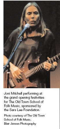 When I arrived, there were already 6-7 "fans" waiting on the sidewalk by the gates to the back entrance/courtyard of the Old Town School of Folk Music (OTSFM). The gates were open, and many of the attendees were milling about smoking and talking to us on the other side of the fence. All was congenial. First I ask if any of the sidewalk crew might be from the discussion list, to which I got "the what?" A man and a woman convinced one of the ticketholders to take an album cover and a guitar in for Joan to sign. Off this poor woman went, shlepping these goods into the concert hall. Not two minutes later she returned, quite apologetic, saying that she was told that Joni would not be signing anything and to please return the items to their owners. The sidewalk crew mumbled and moaned their discontent- the "who-does-she-think-she-is-too-good-to-sign-for-fans-now" kind of whine.