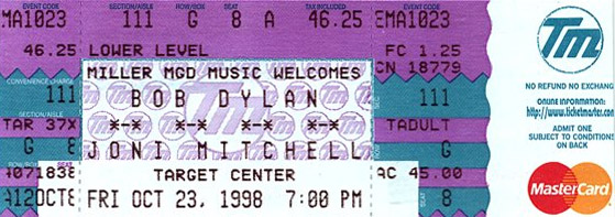 First: a couple of problems with the show. Number one, I *really* hope Joni comes back to Minneapolis sometime soon as a headlining act - a lot of people were there just to see Bob, so a sizable portion of the audience just wasn't paying a lot of attention during Joni's set, which was a big drag. I also think (as mentioned in the other reviews) that she'd benefit greatly from a more intimate venue than a big shed like the Target Center (the Orpheum or the State Theater would be outstanding).